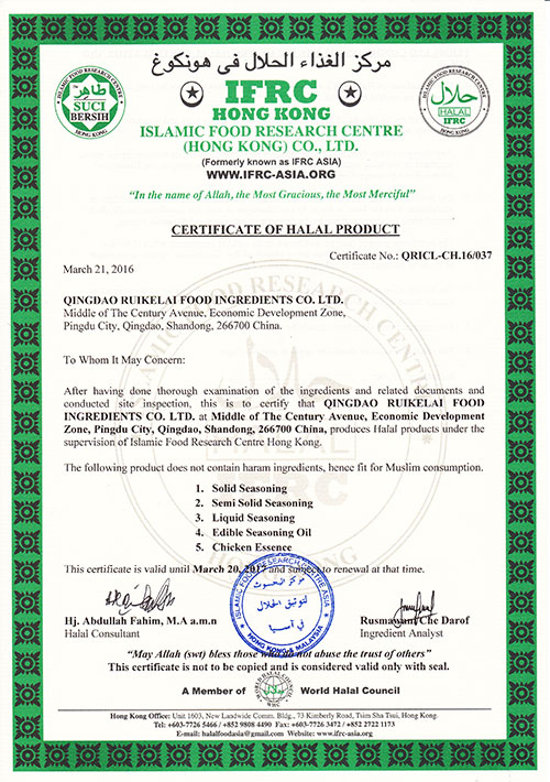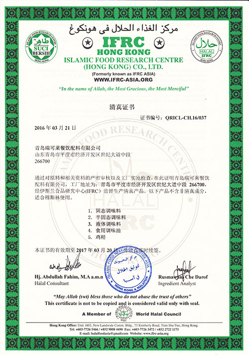 2016年3月,青島瑞可萊餐飲配料有限公司順利通過國際Halal清真認證。