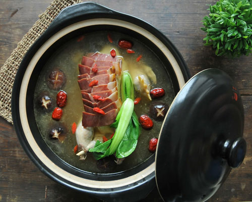 3、將老母雞和火腿洗凈入砂鍋中,加大半鍋子水,加入適量蔥姜料酒。
