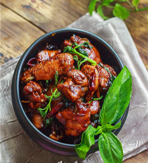 5、大火煮開,加入雞肉香膏,小火慢燉20分鐘左右,一直燉煮到湯汁濃稠,顏色變深,放入洗凈的羅勒,快速翻炒均勻出鍋。