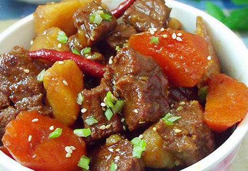 調(diào)料:牛肉鮮香粉、土豆適量、大蔥適量、胡蘿卜適量、姜片適量、八角適量、紅辣椒適量、桂皮適量、蘋果適量